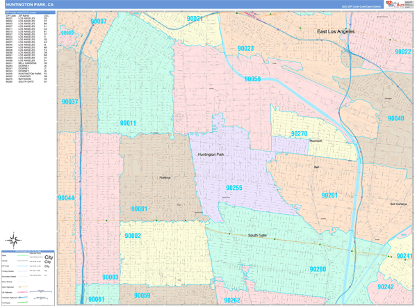 Huntington Park California Zip Code Wall Map (Red Line Style) by