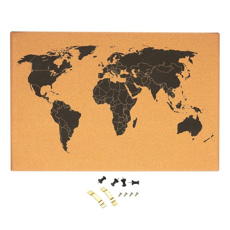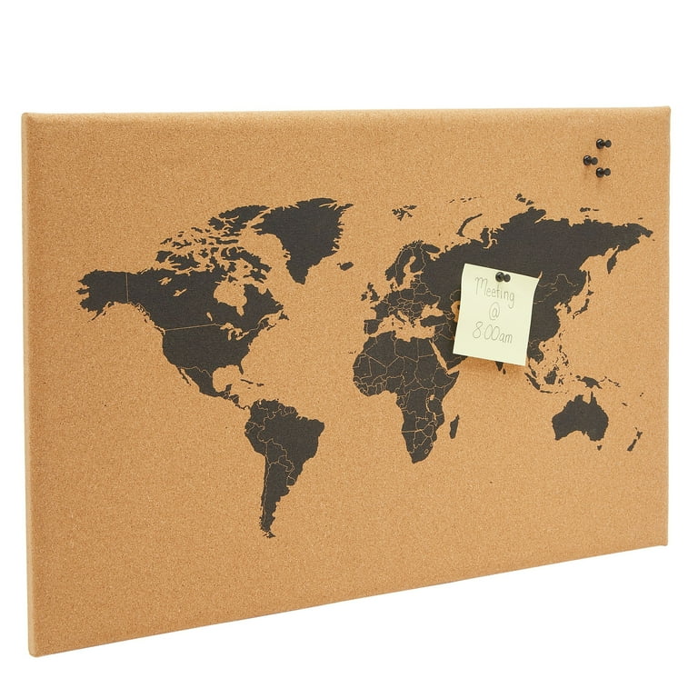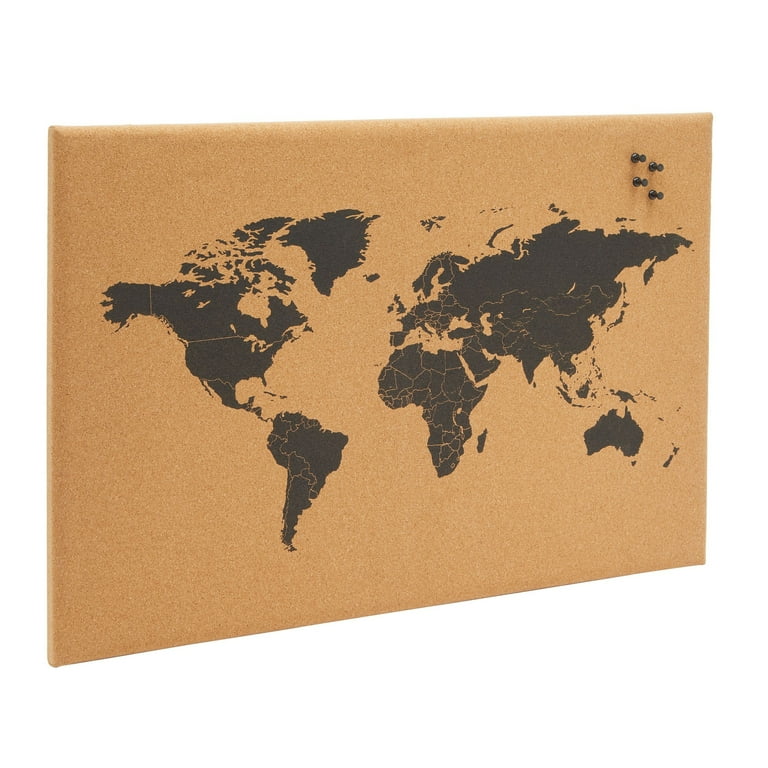 Cork Board World Map with Push Pins and Screws, Home and Office